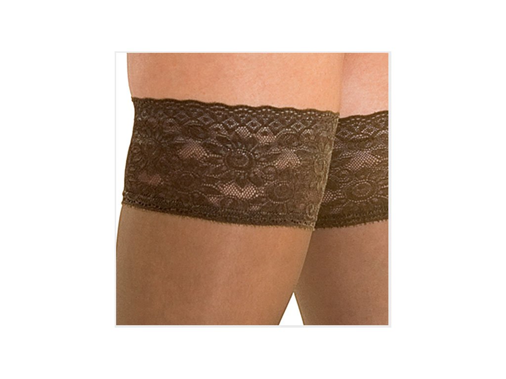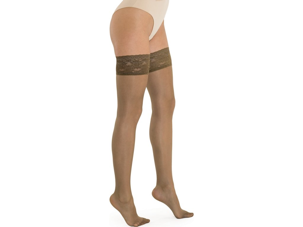 Samodržící průsvitné a jemné zdravotní kompresní punčochy s krajkovým lemem 70 den z hladké pleteniny. Nabízejí půvab a ženskou smyslnost. Graduovaná komprese poskytuje úlevu nohám a předchází jejich únavě a ztěžknutí.