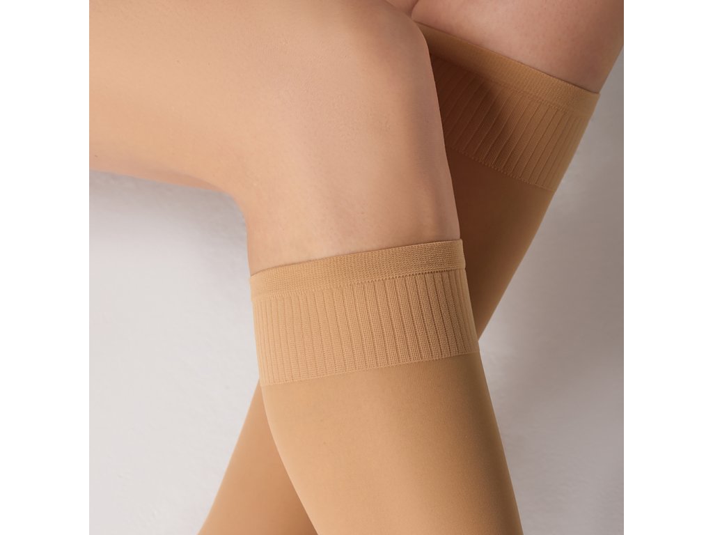 Průsvitné podkolenky s hustotou 70 den, graduovanou kompresí 12/15 mmHg a otevřenou špičkou, ideální na léto. Tento produkt je indikován pro regulaci a zmírnění žilního a lymfatického návratu a prevenci jedné nebo více poruch krevního oběhu (např. otoky, hluboká žilní trombóza (DVT), křečové žíly a lymfedém). Elegantní a měkké, jsou ideální pro moderní ženu, která kombinuje dynamiku a styl. Otevřená žabková špička je vyrobena s inovativní technologií, která umožňuje perfektní padnutí, udržuje podkolenkyv ve správné poloze na noze a zajišťuje větší svěžest a příjemný pocit pohodlí pro chodidla a nohy i v nejteplejších měsících, díky čemuž jsou pohodlnější na nošení. Jsou vhodné zejména pro osoby s výraznou citlivostí nebo deformacemi prstů. Pohodlná elastická opora. Ideální pro dlouhé cesty letadlem, vlakem nebo autem. S antimikrobiální úpravou.
